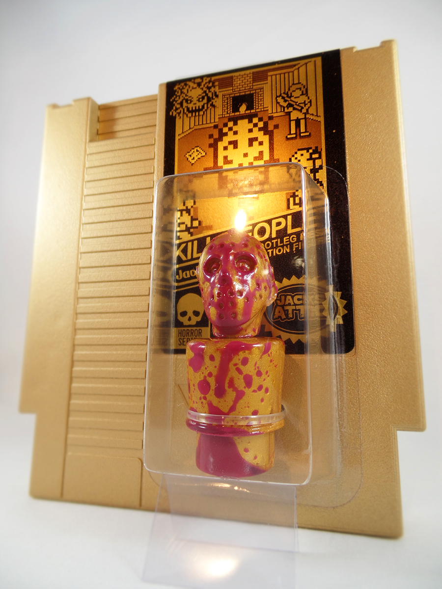 The figure will come attached to a vintage, repurposed (non-functioning) Nintendo cartridge complete with a custom authentic style game label and hang tag ready for display.