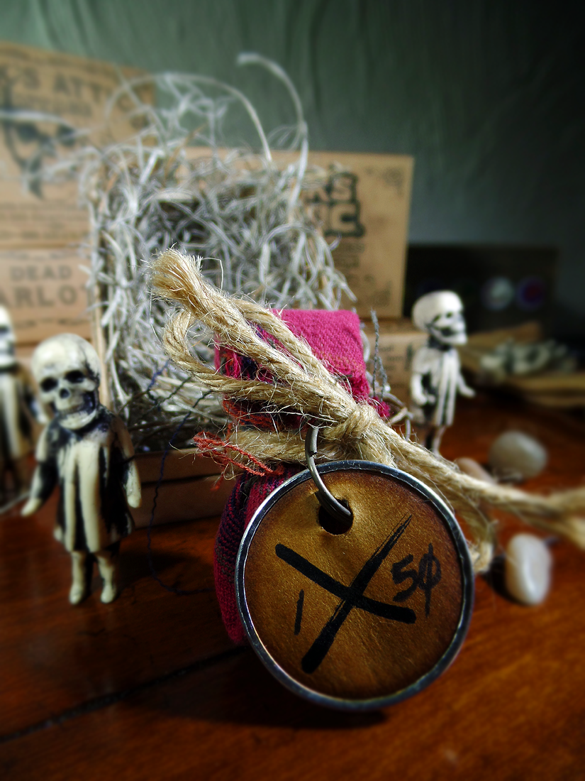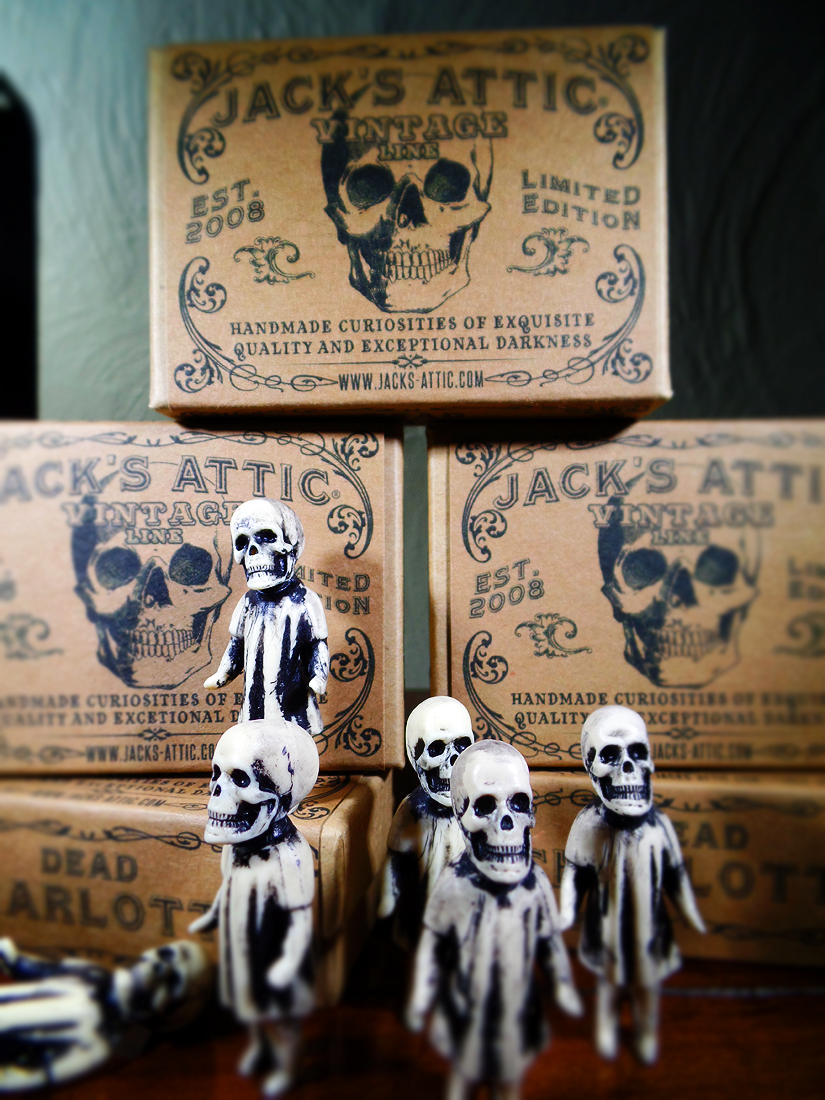 Standing just under two (2) inches tall, Dead Charlotte has been carefully hand distressed to give her an aged look. Coupled with the vintage packaging the overall experience invokes a dated feeling. Of finding a forgotten treasure tucked away in a dark corner of your grandparent’s attic. Something from an earlier time. Something strange and a bit dark.