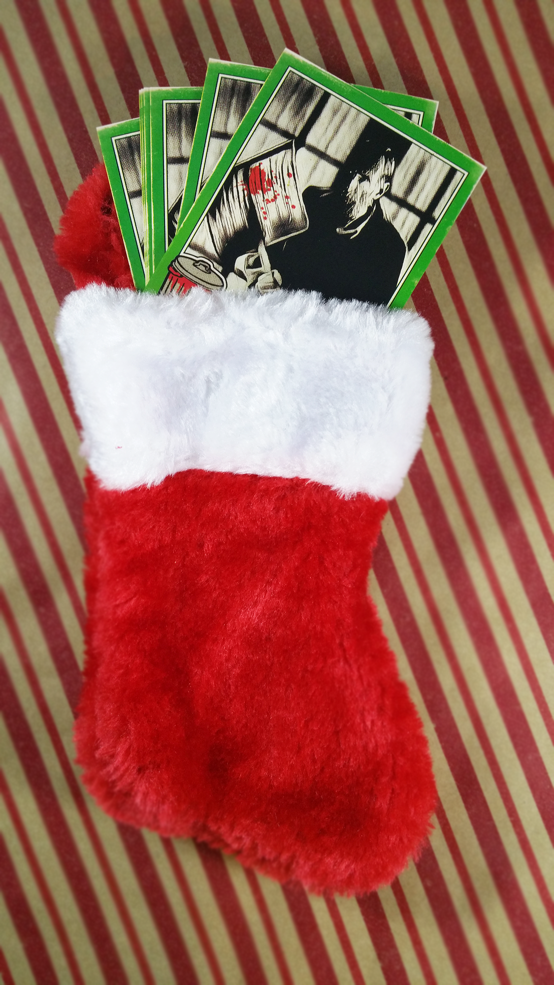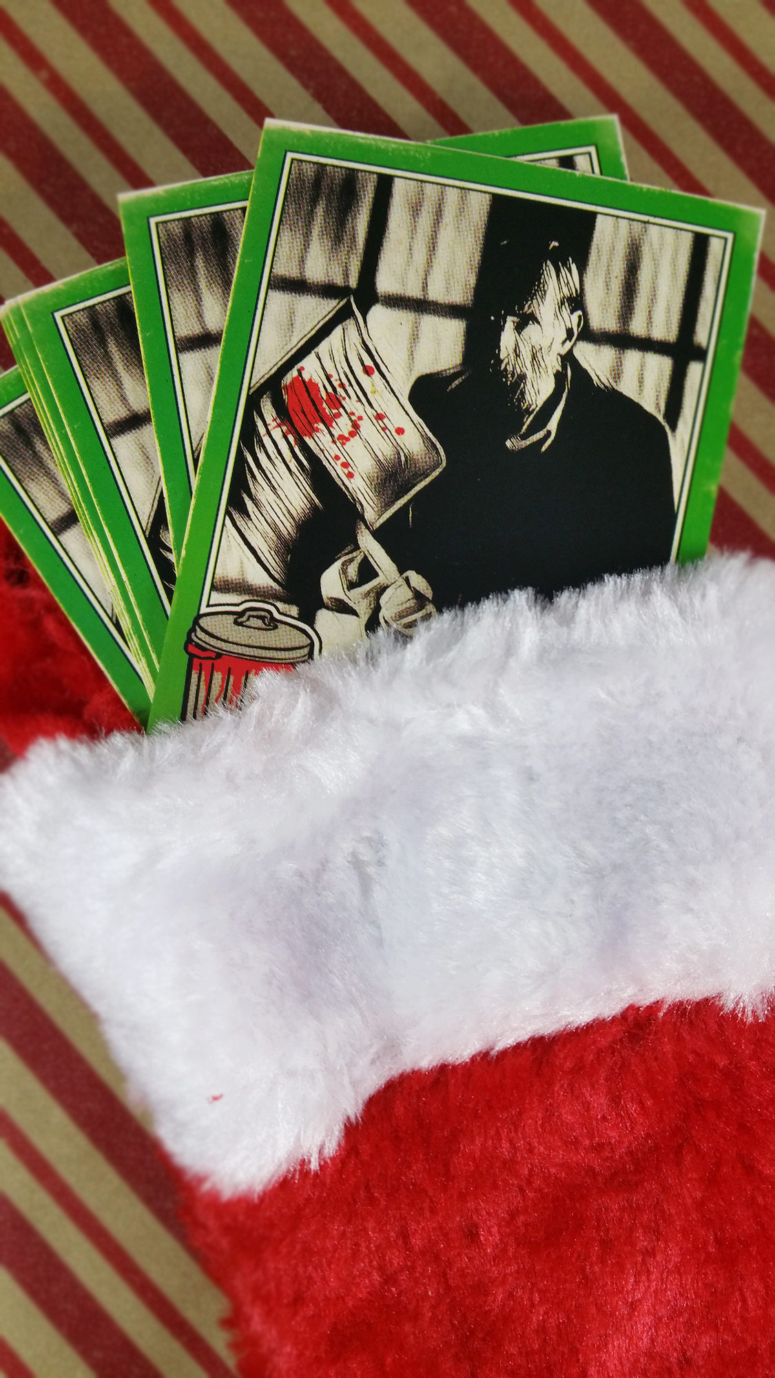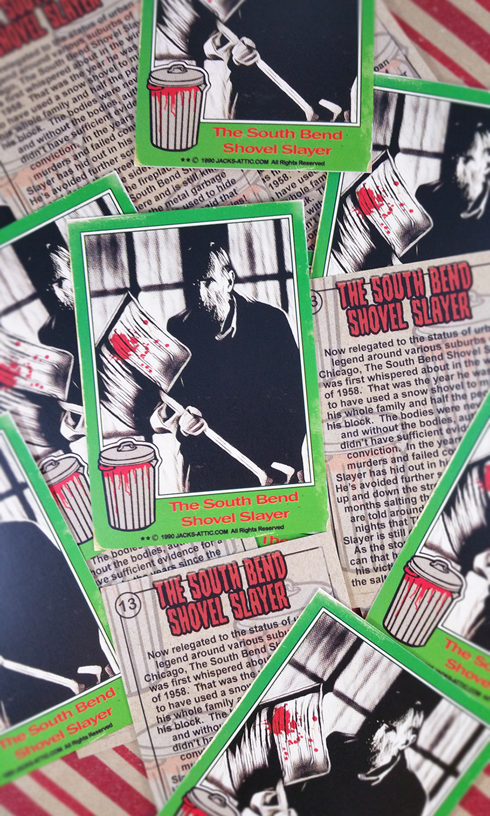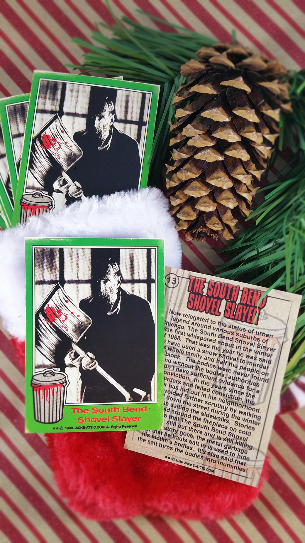 When I was a kid, around Christmas time, my cousin Buzz told me the story of the South Bend Shovel Slayer. He was a local boogeyman that had killed his whole family with a shovel and somehow got away with it. Since that time I always feel a growing sense of dread as Christmas draws near. And now I hope to pass those feelings along to you with my latest trading card offering.