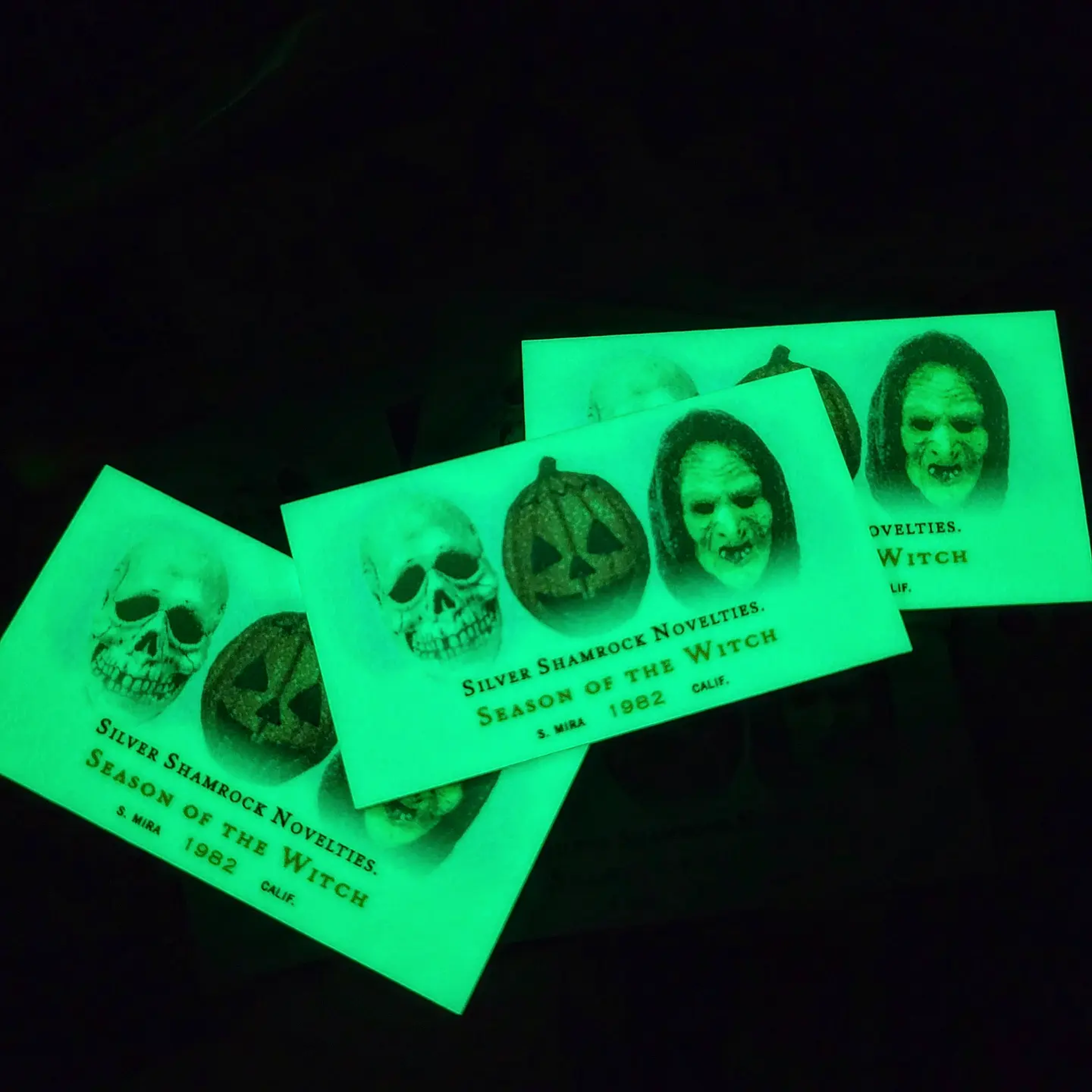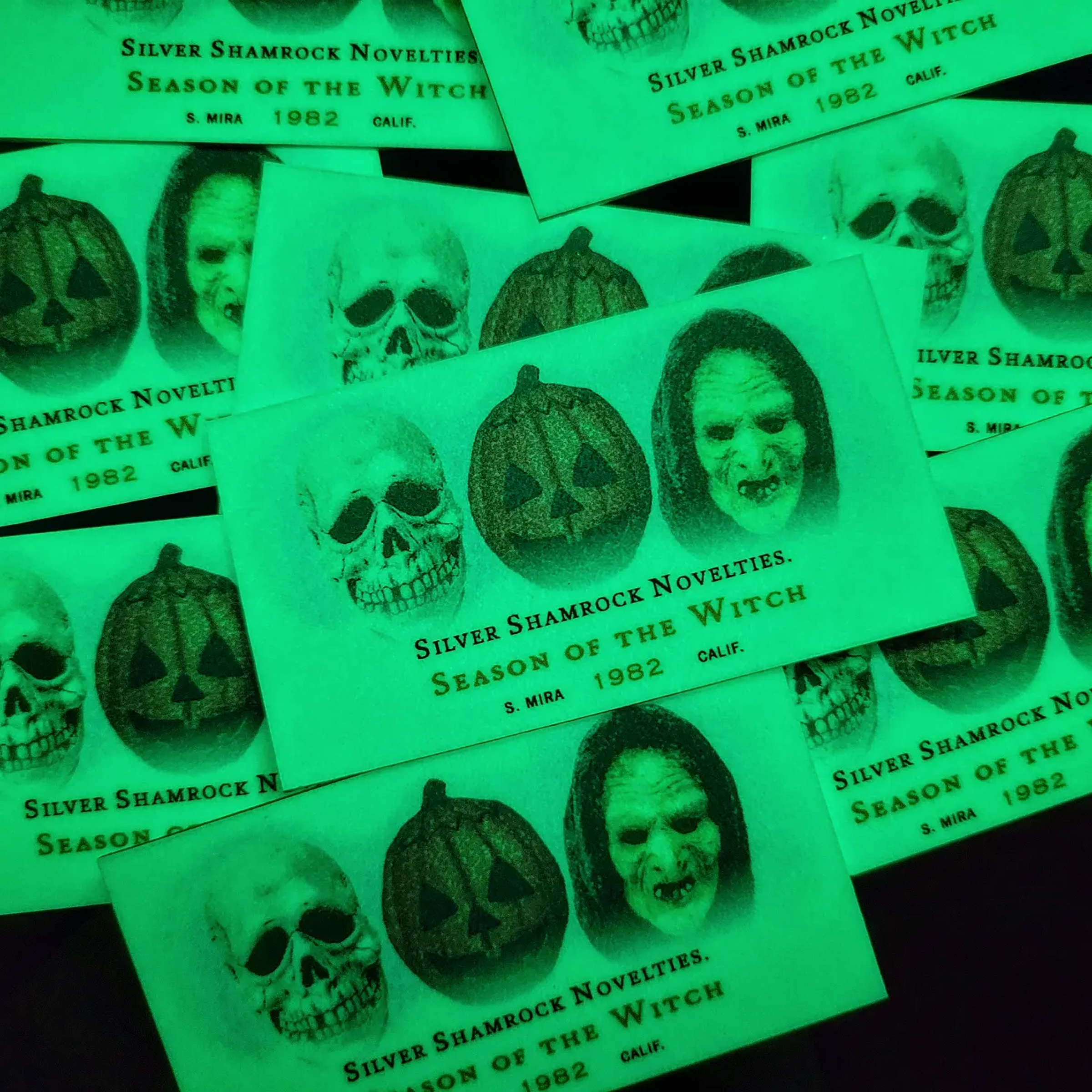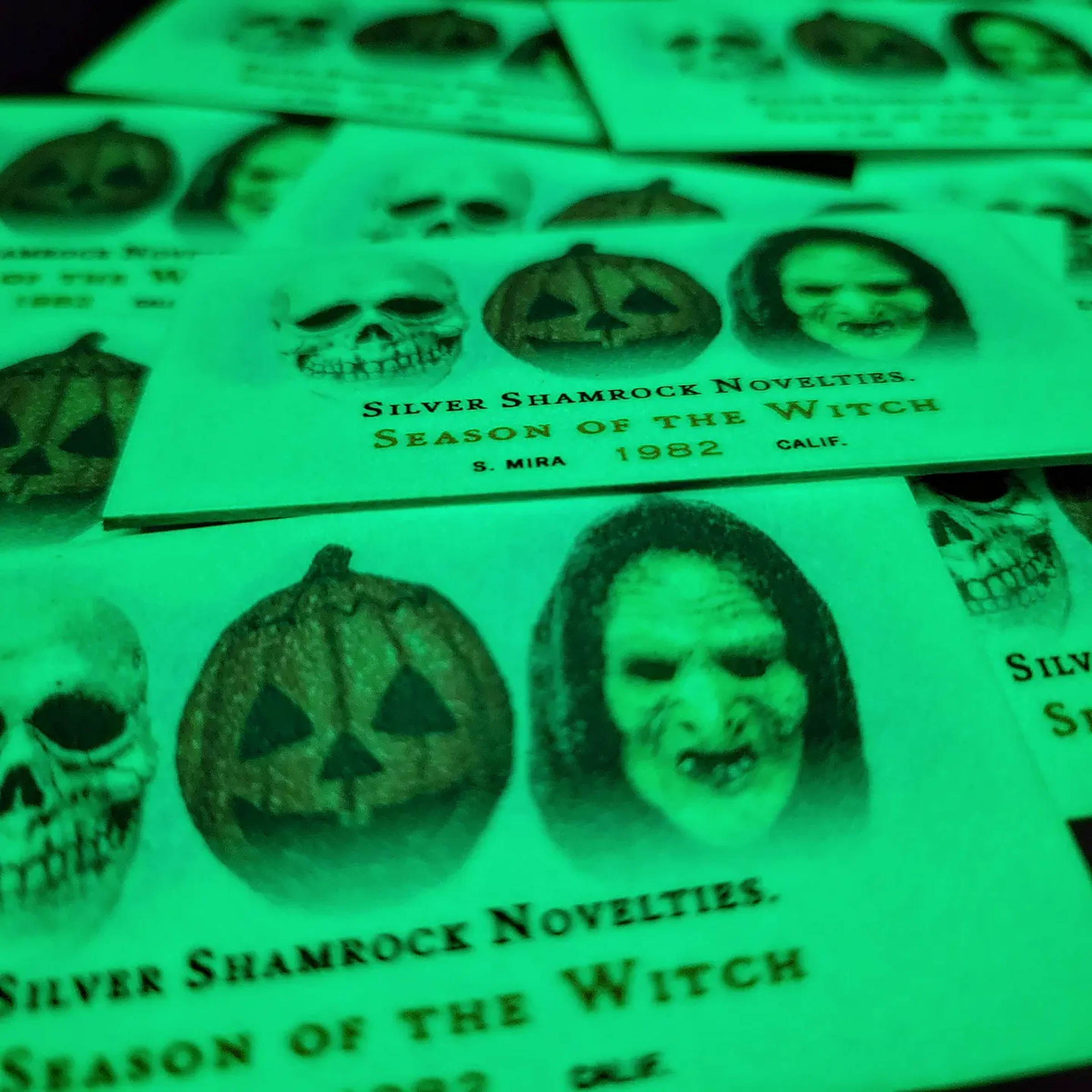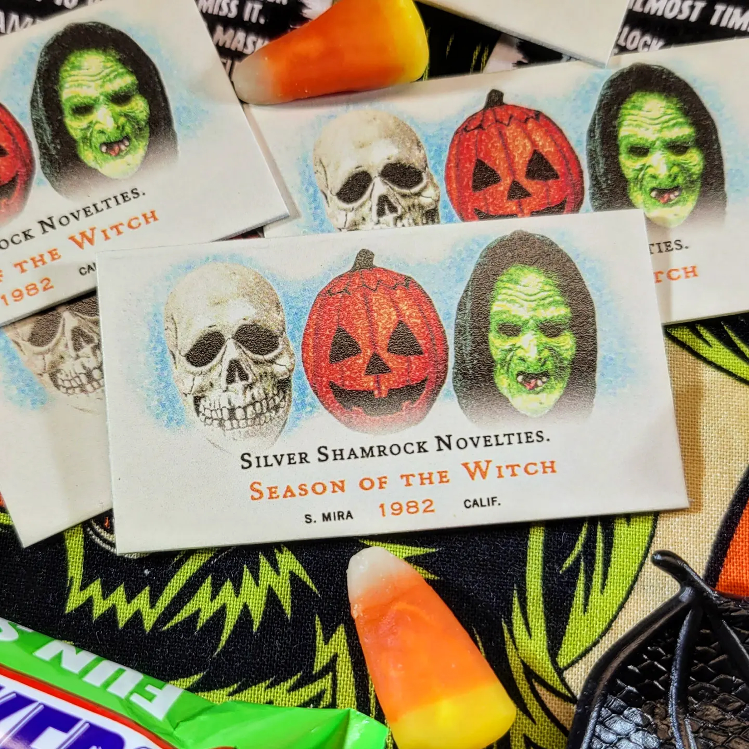 The card pays homage to the sinister Silver Shamrock Novelties' deadly Halloween plans and the night no one comes home.