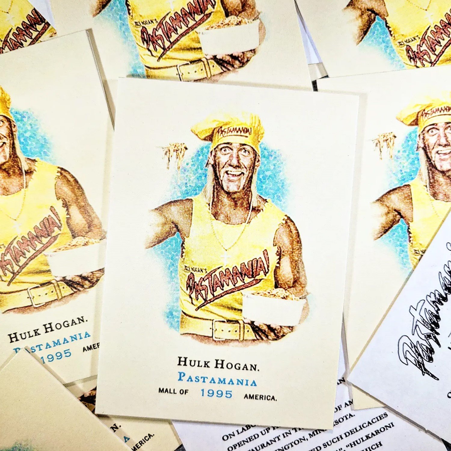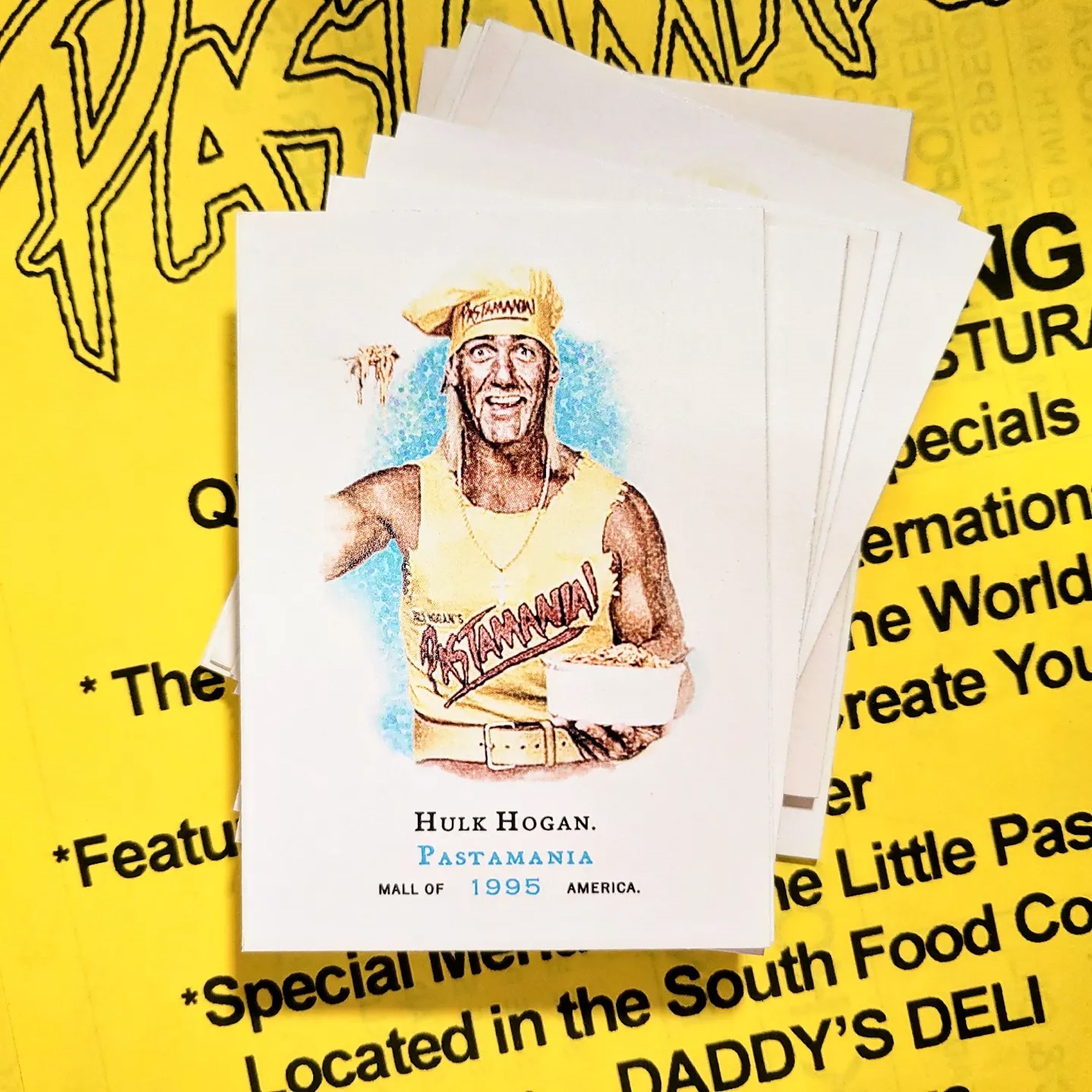 For all of his success in the world of professional wrestling, The Hulkster seemed to make a lot of bad decisions outside of the squared circle. Business ventures that went nowhere, failed wrestling promotions and questionable endorsements shadow his non-wrestling endeavors. Maybe none as laughable and misguided as his failed Pastamania restaurant in the Mall of America. This trading card release lovingly commemorates that blunder.