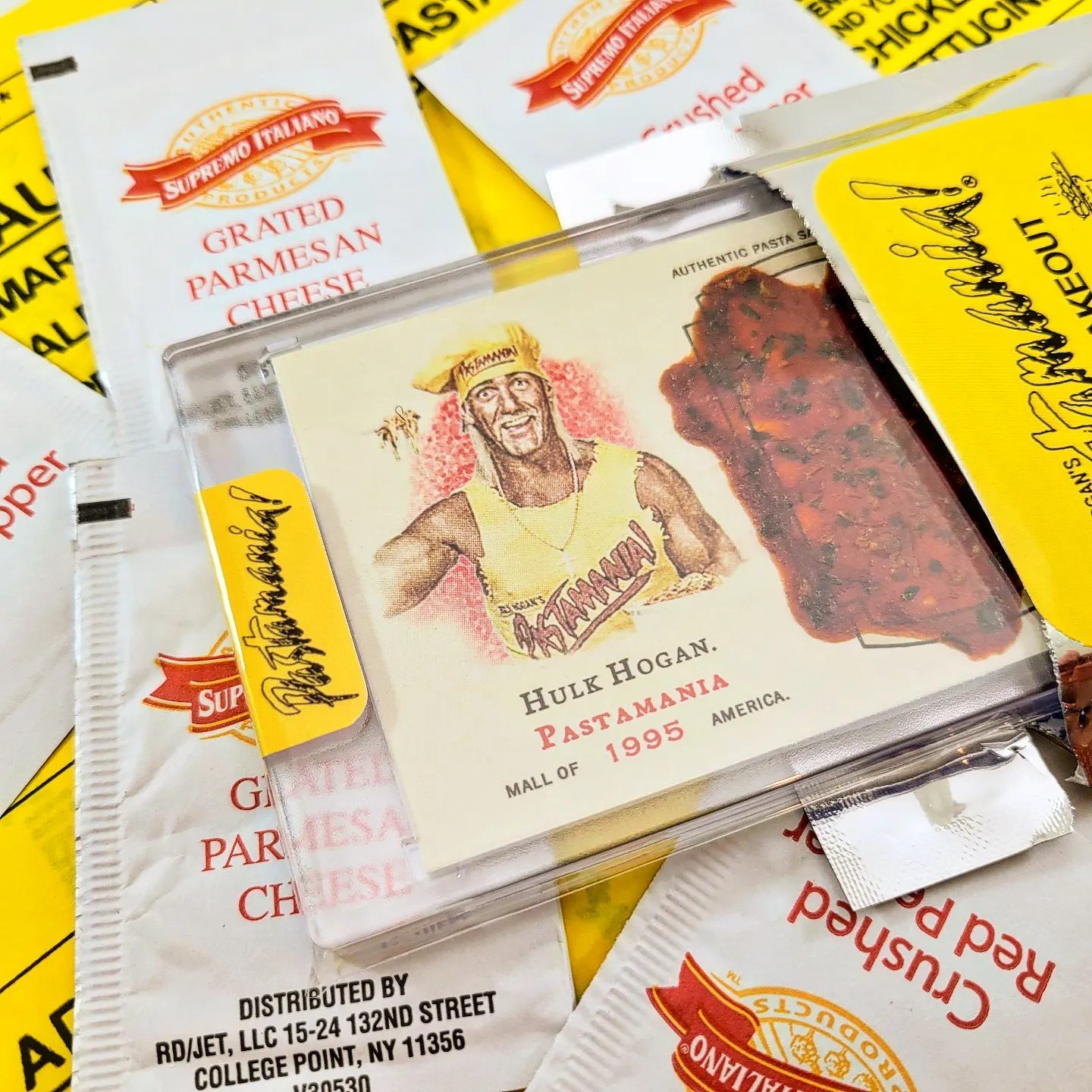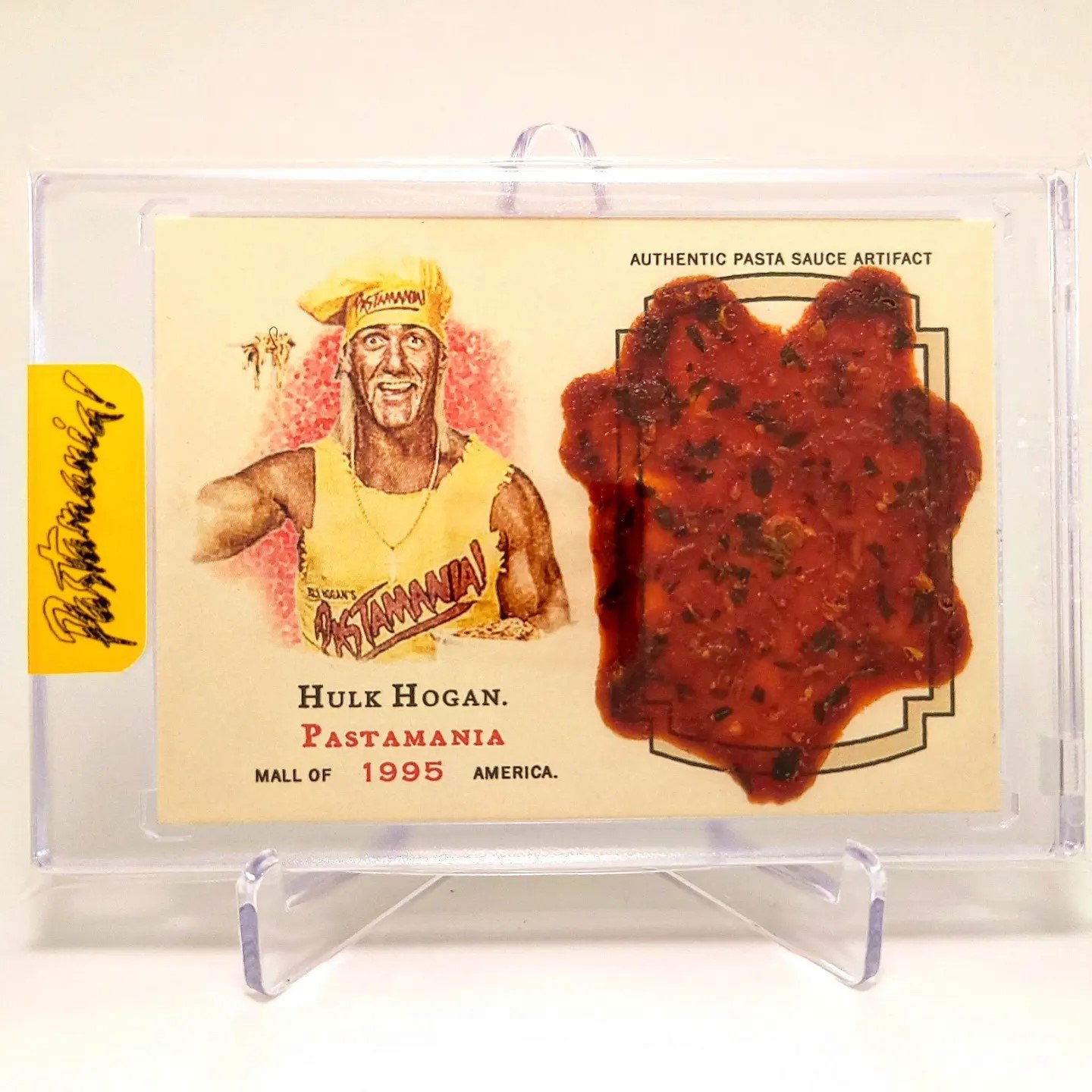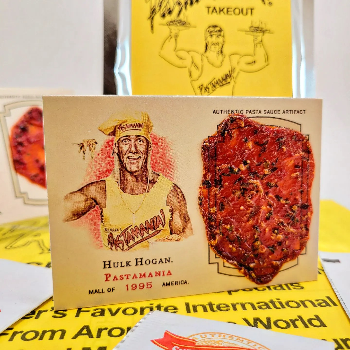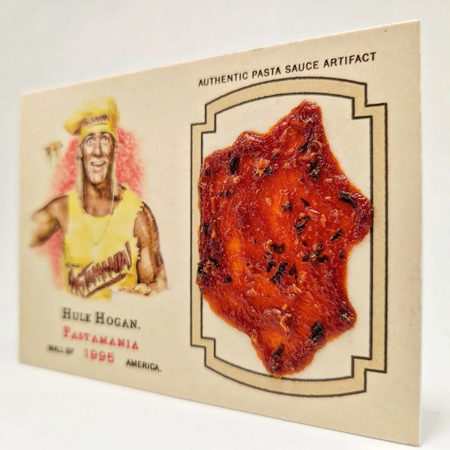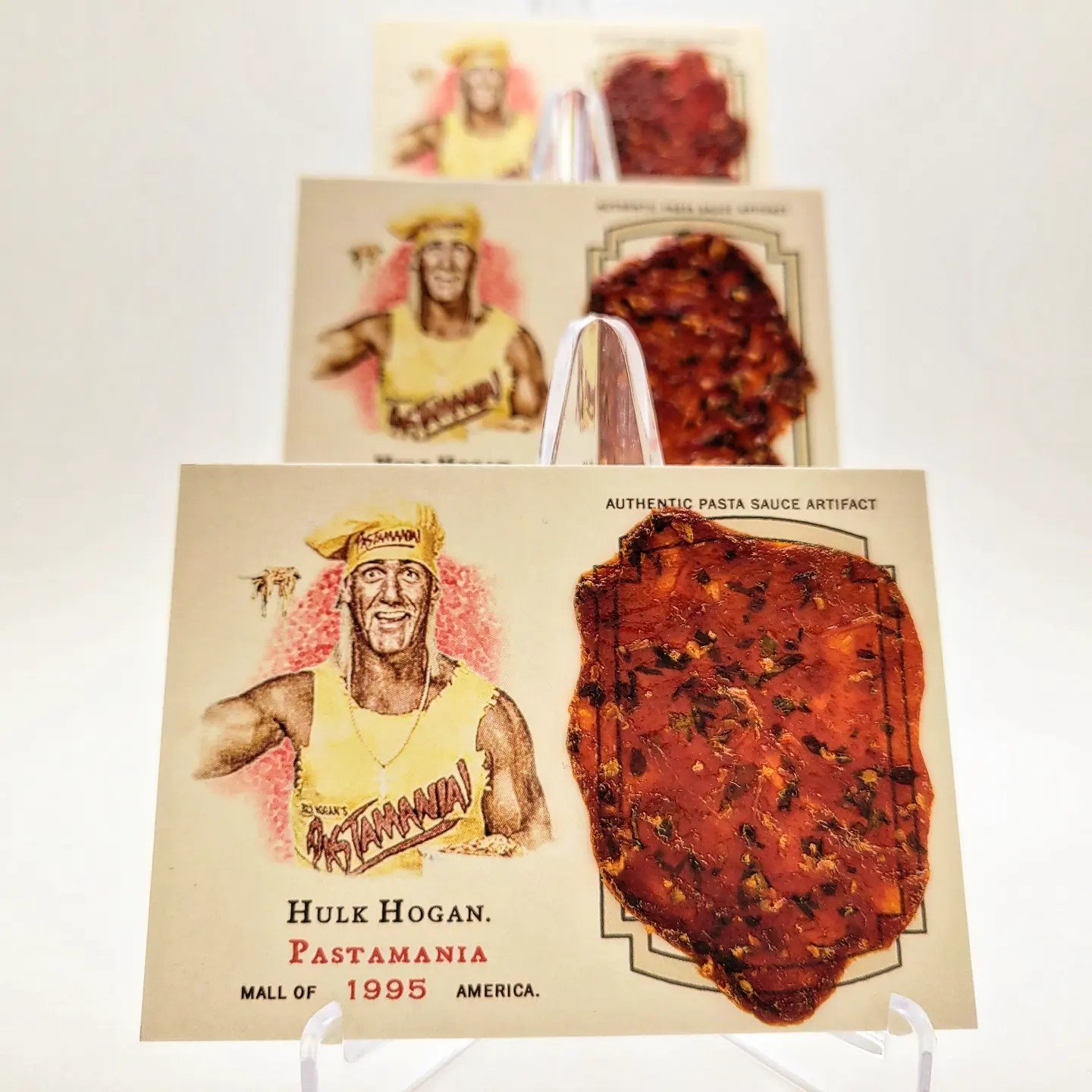 Each card features an authentic jumbo pasta sauce artifact that is over 50% larger than the original Pastamania card.