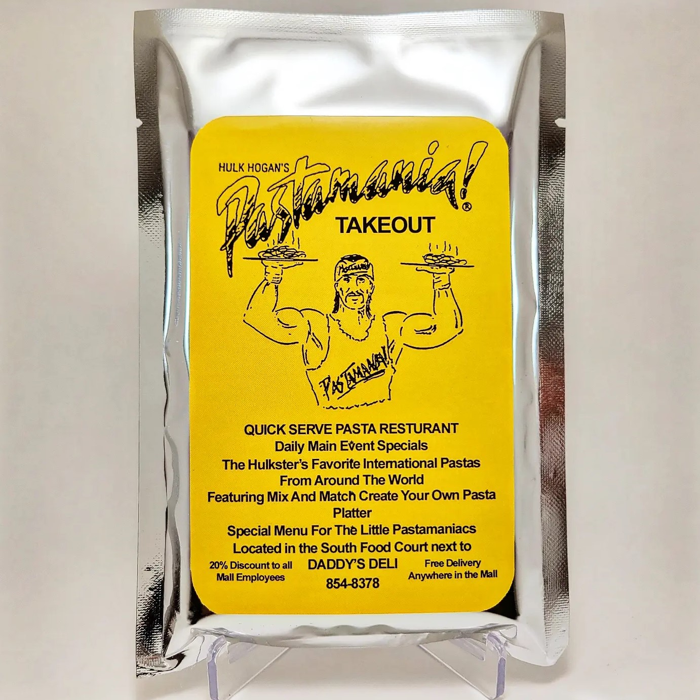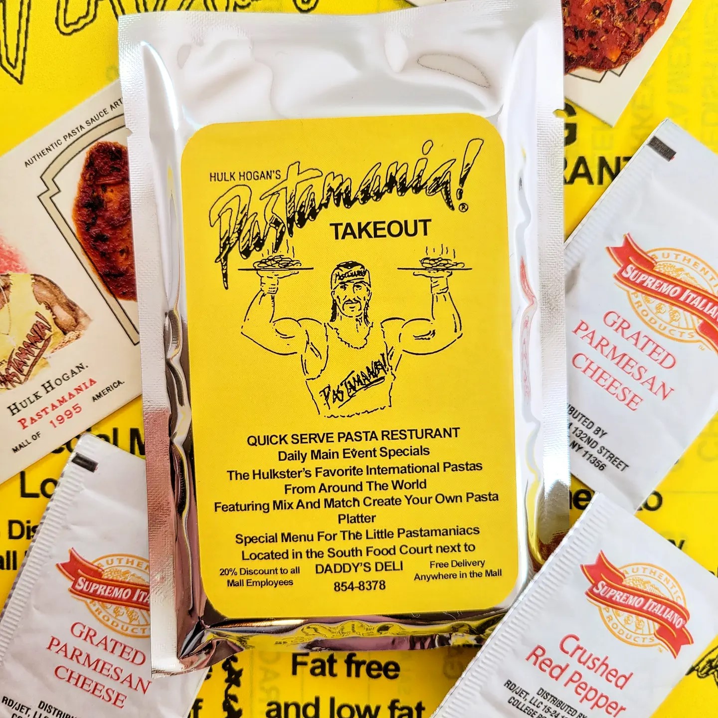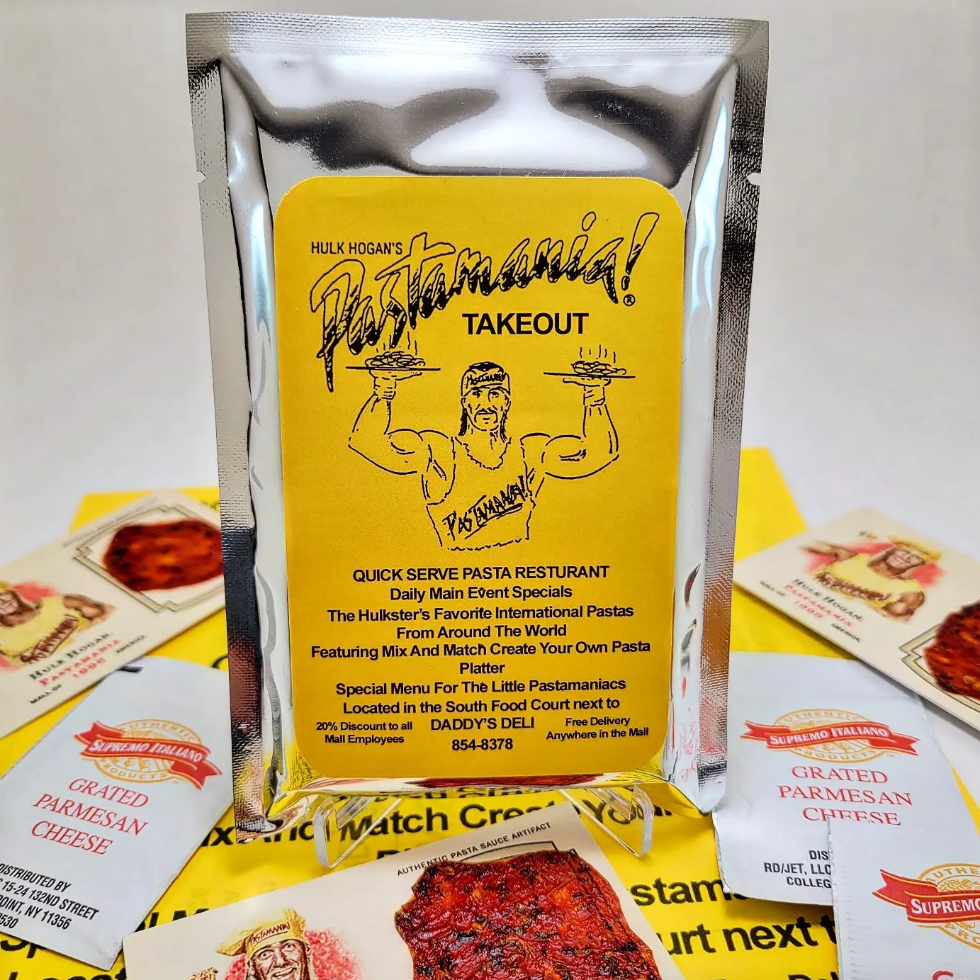 They come packaged in a foil "take out" pouch with a complimentary packet of grated Parmesan cheese and crushed red pepper. The card also comes with a faithfully recreated replica of the Pastamania menu.