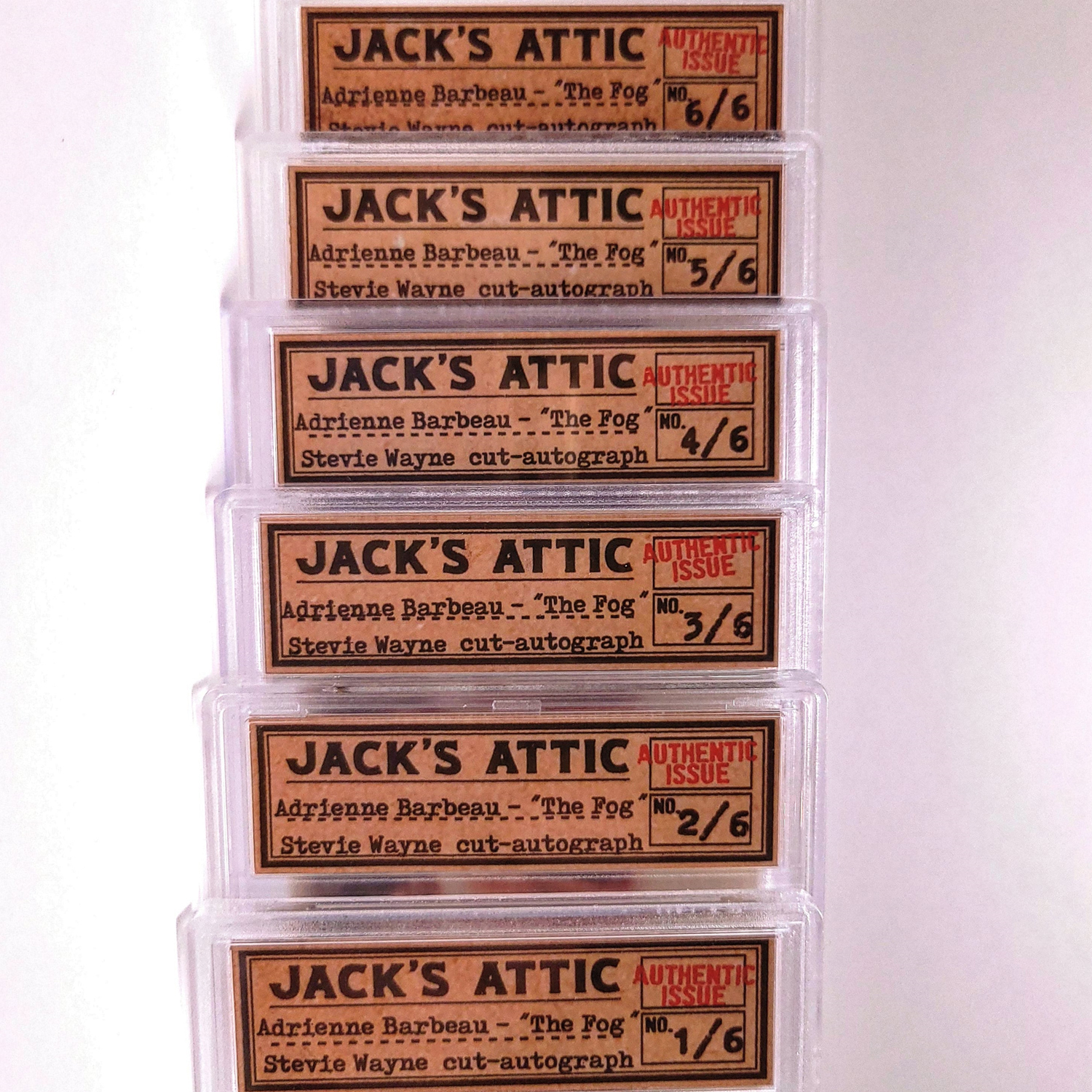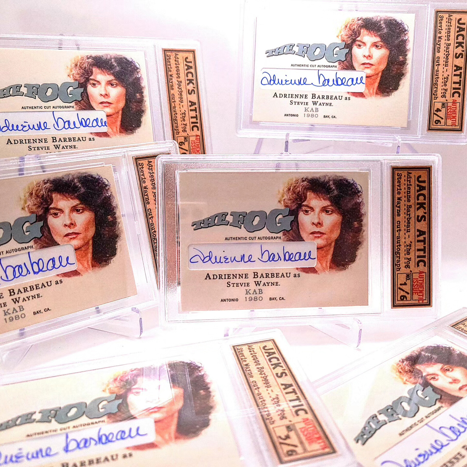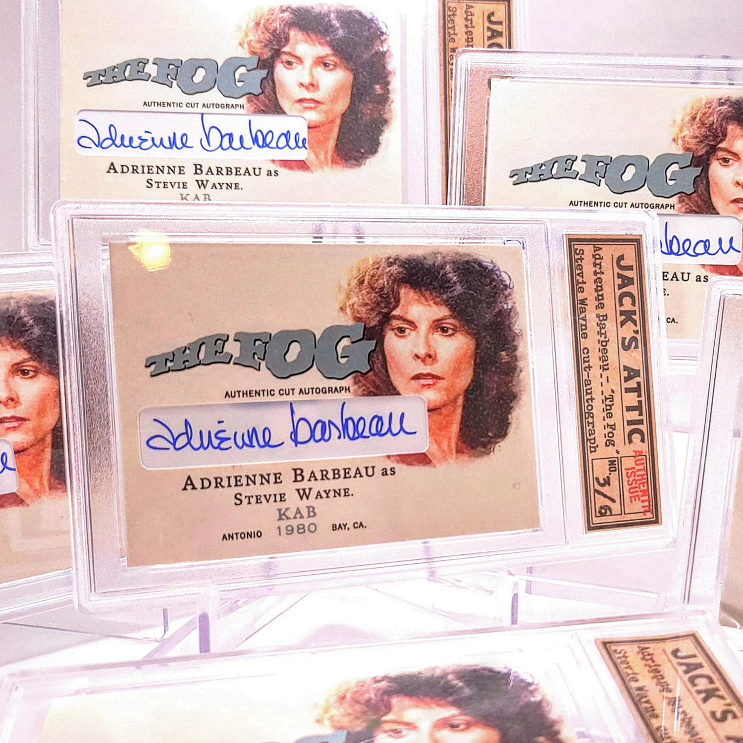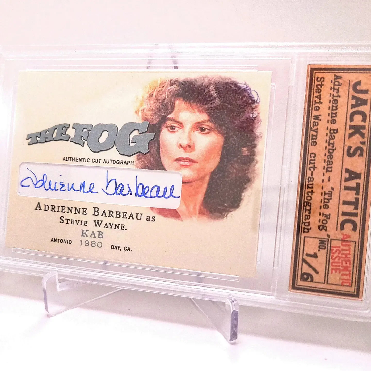 This custom trading card from Jack's Attic pays homage to John Carpenter's atmospheric classic, the cinematic ghost story, The Fog and contains an authentic cut autograph from Adrienne Barbeau who portrayed intrepid radio DJ and lighthouse heroine, Stevie Wayne.