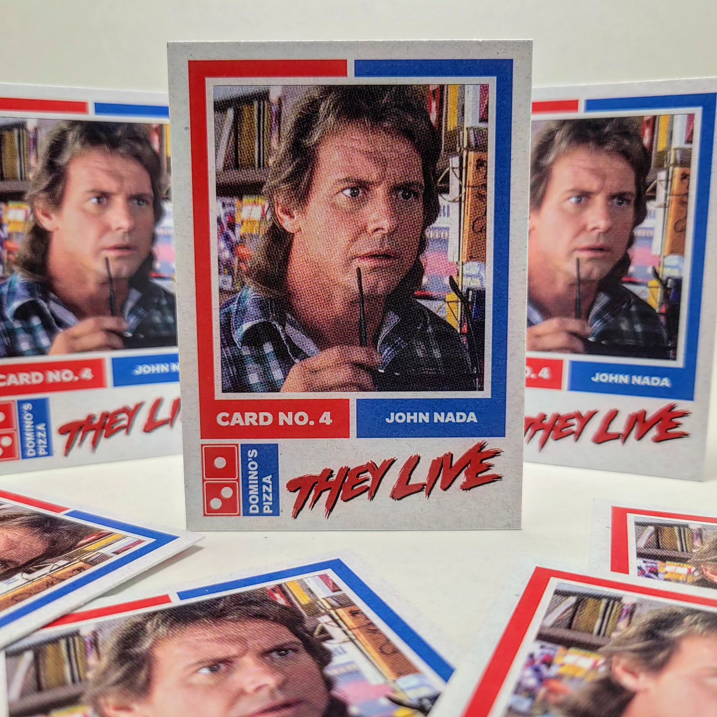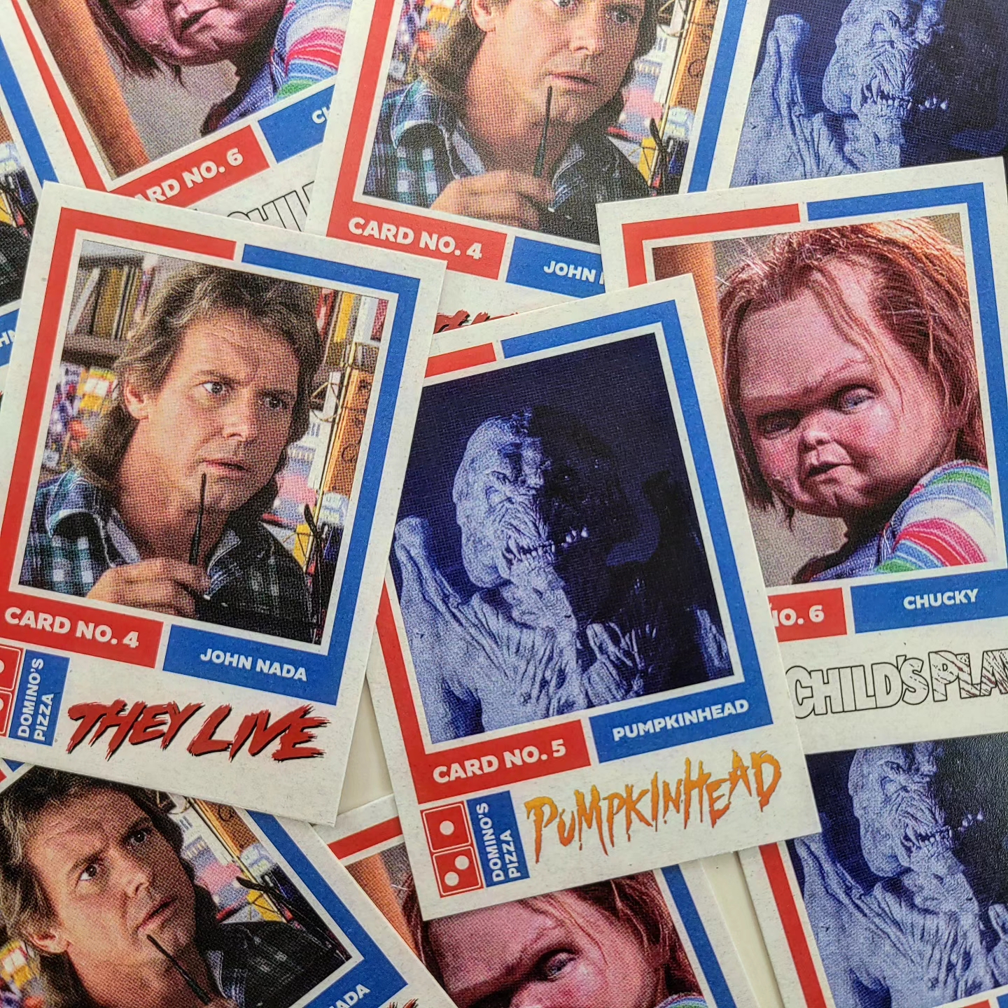 This release from Jack's Attic imagines a world in which you could walk into a Domino's Pizza back in 1988 around Halloween time and get not only a delicious large pepperoni pie but also a trading card set featuring John Nada from John Carpenter's They Live, the demonic Pumpkinhead and everybody's favorite Good Guy, Chucky from Child's Play.