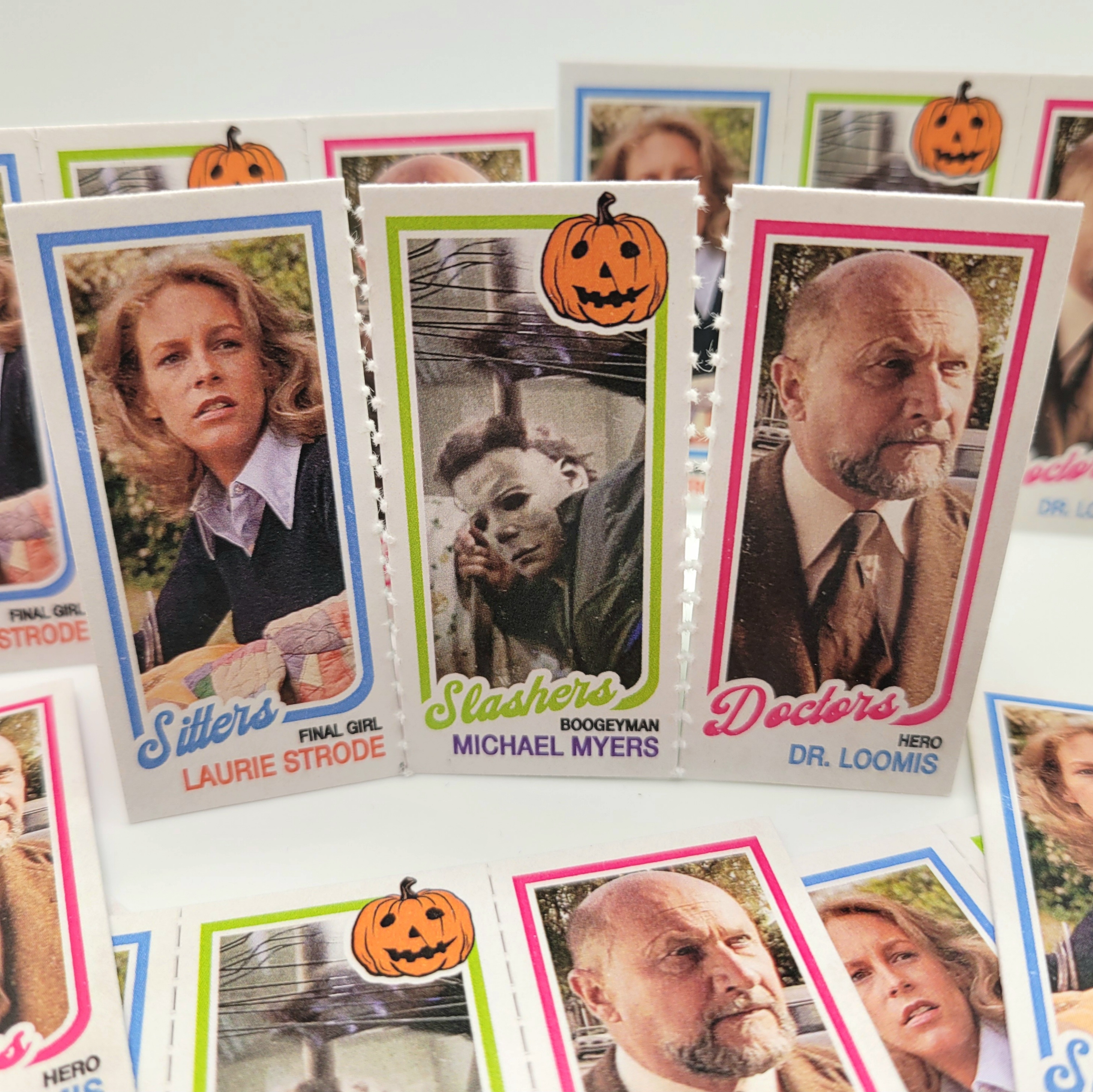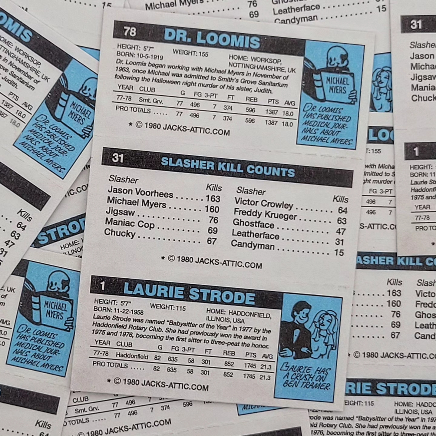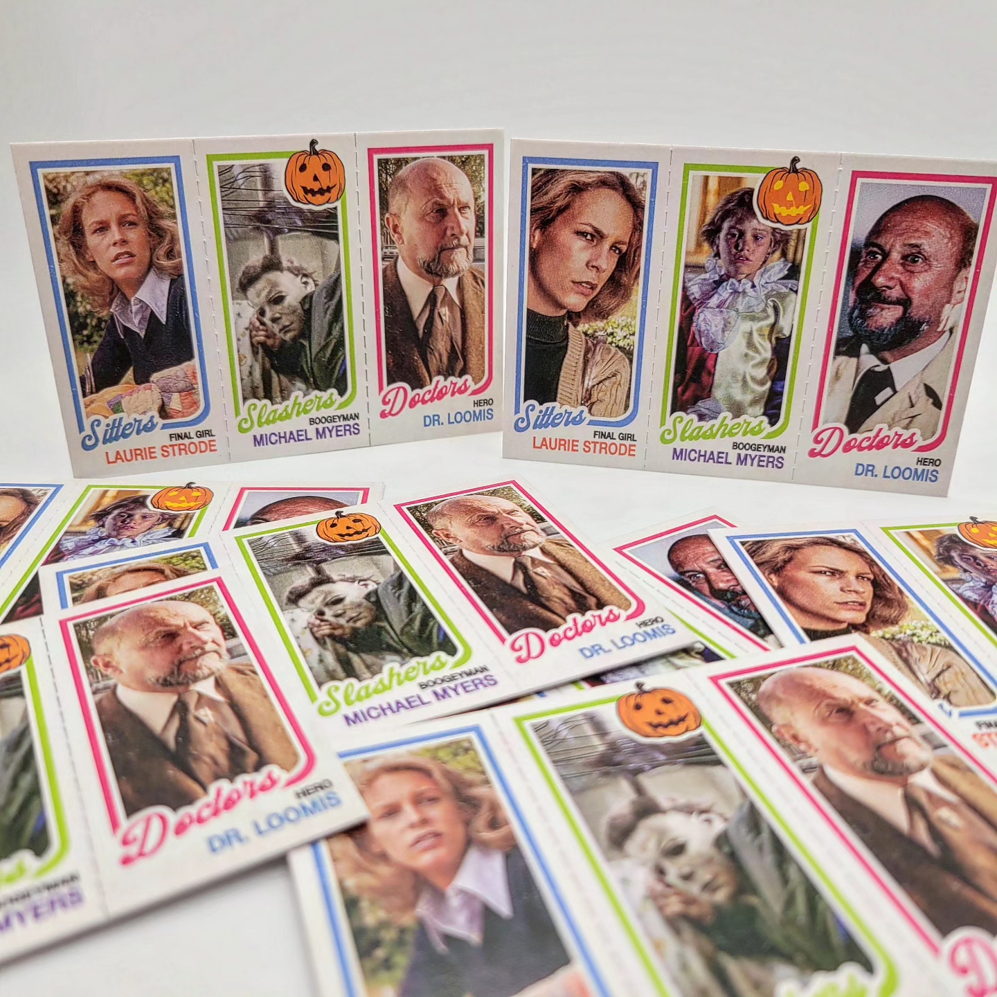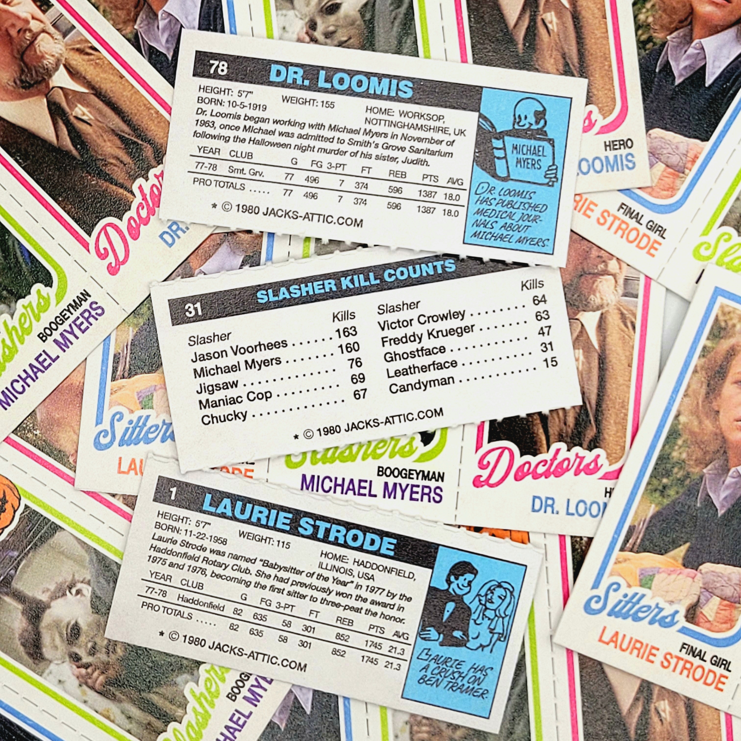This triptych style card with a design inspired by the 1980-81 Topps basketball set, features everyone's favorite Halloween slasher, the doctor trying to stop him and the greatest final girl in film history.