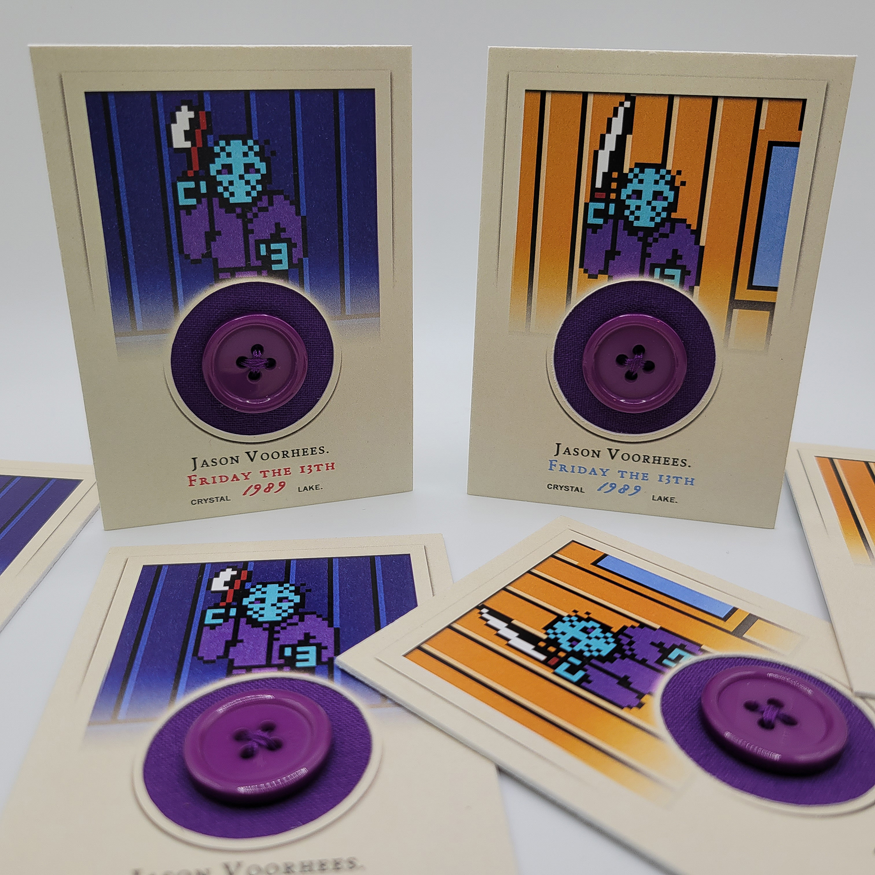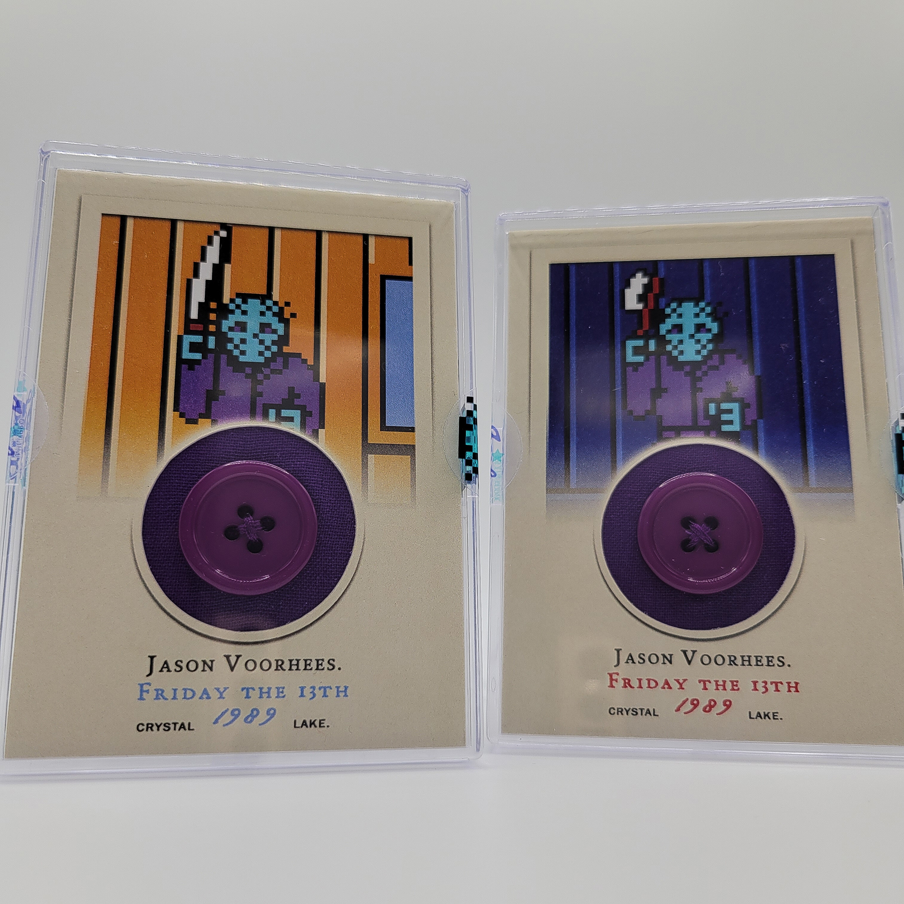 Paying homage to everyone's favorite camp slasher and his wildly misunderstood 8-bit debut, this limited edition trading card from Jack's Attic fabricates what a relic card featuring a button and swatch of fabric from Jason's purple jumpsuit might look and feel like.