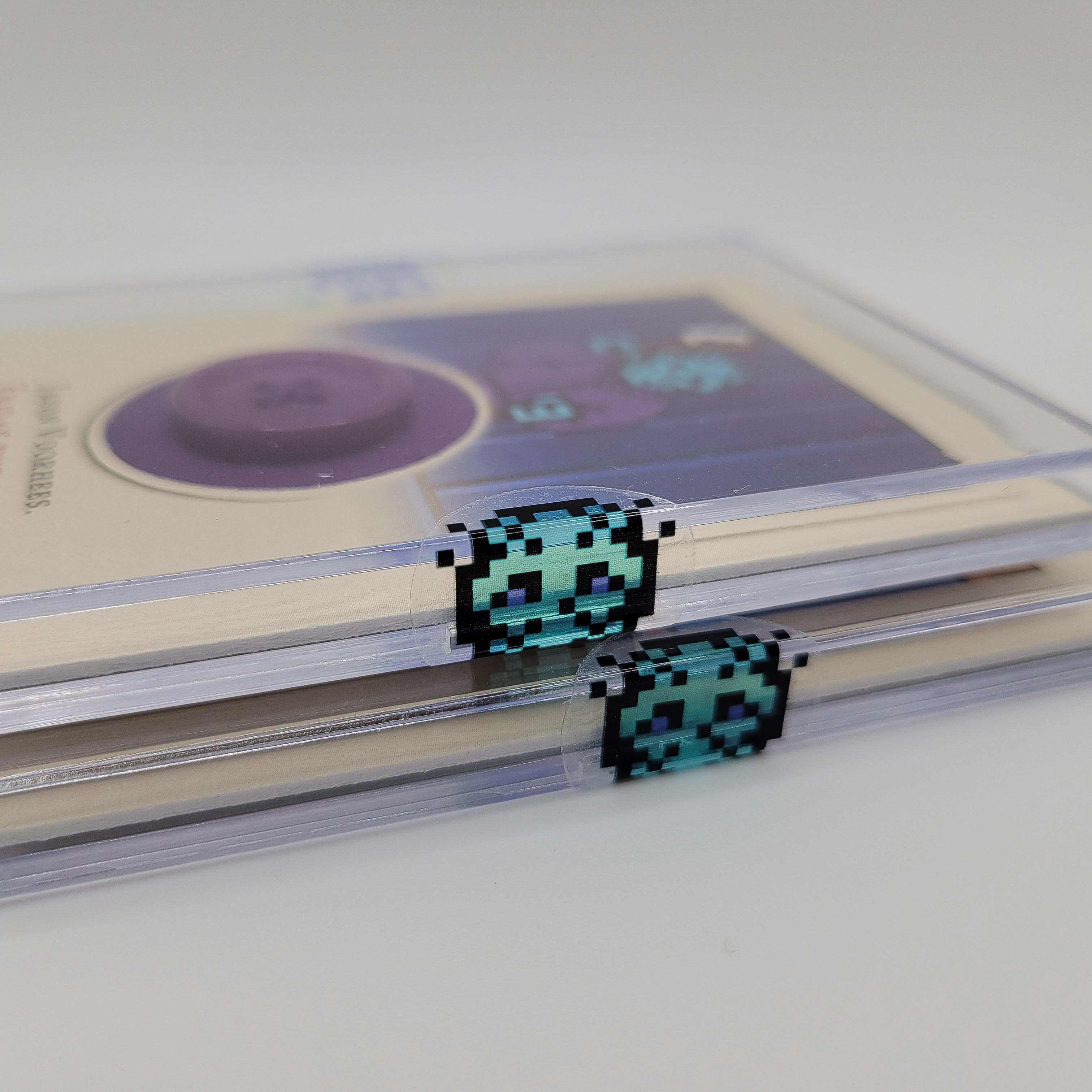 Limited to 40 hand-numbered pieces for each of the daytime cabin scene and it's nighttime counterpart, each card contains an actual hand-sewn "videogame worn" button and purple fabric swatch.