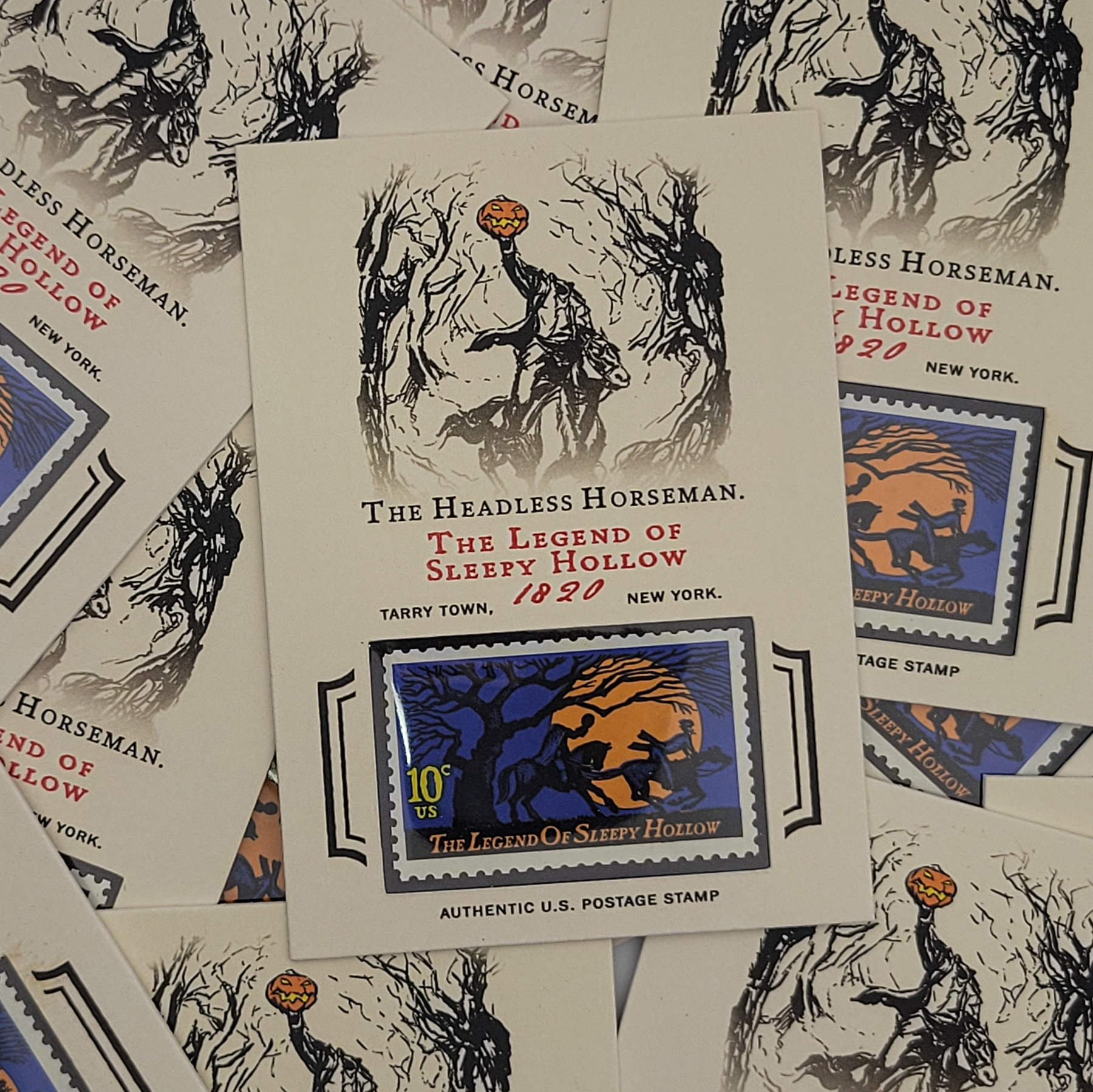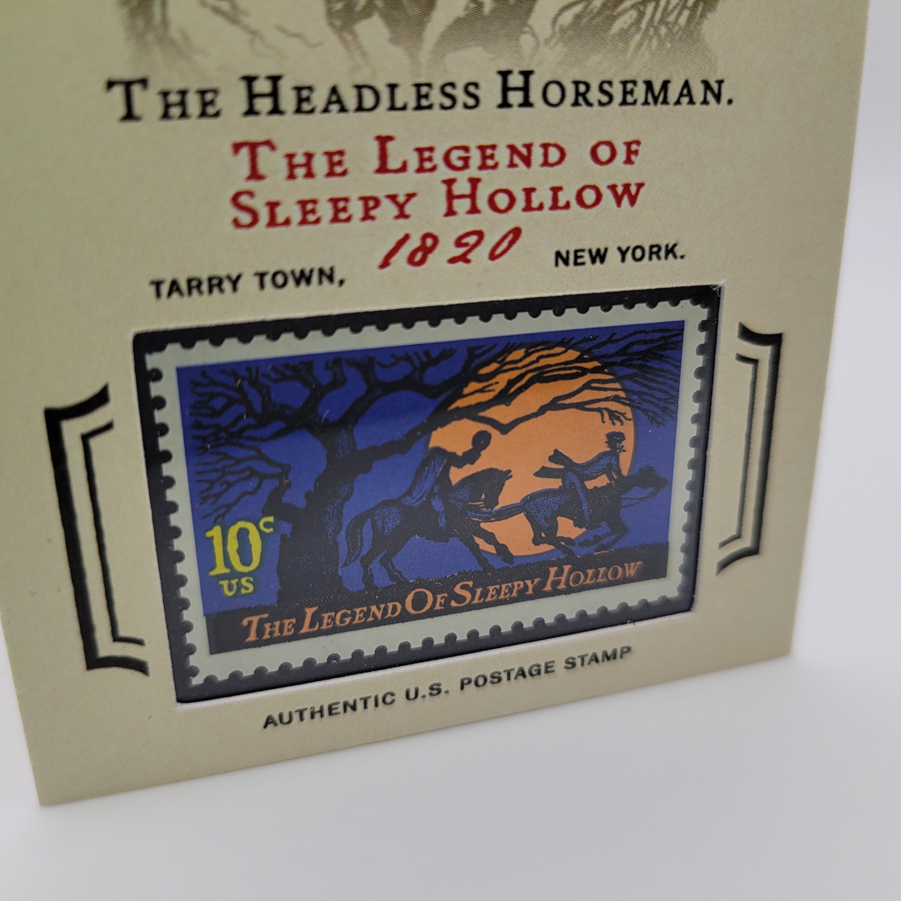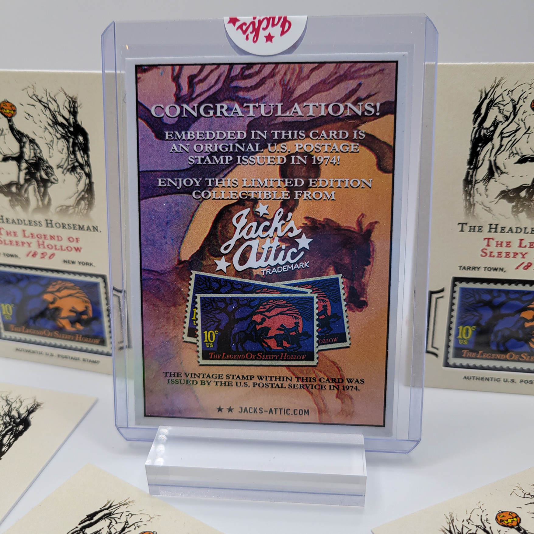 A loving tribute to Washington Irving's atmospheric masterpiece, this artifact card from Jack's Attic pays tribute to The Legend of Sleepy Hollow and the commemerative postage stamp that was issued 50 years ago by the United States Postal Service.