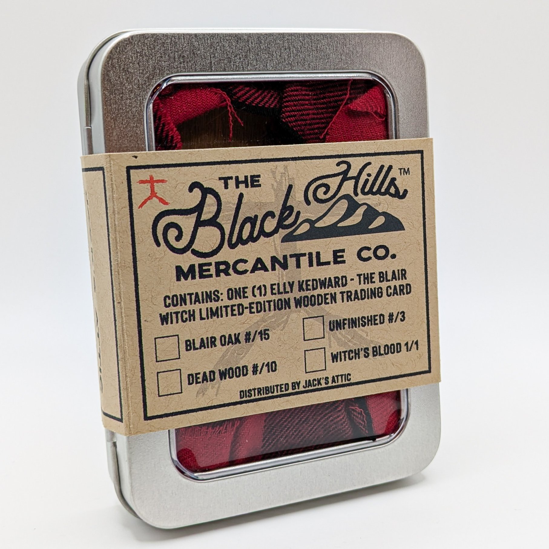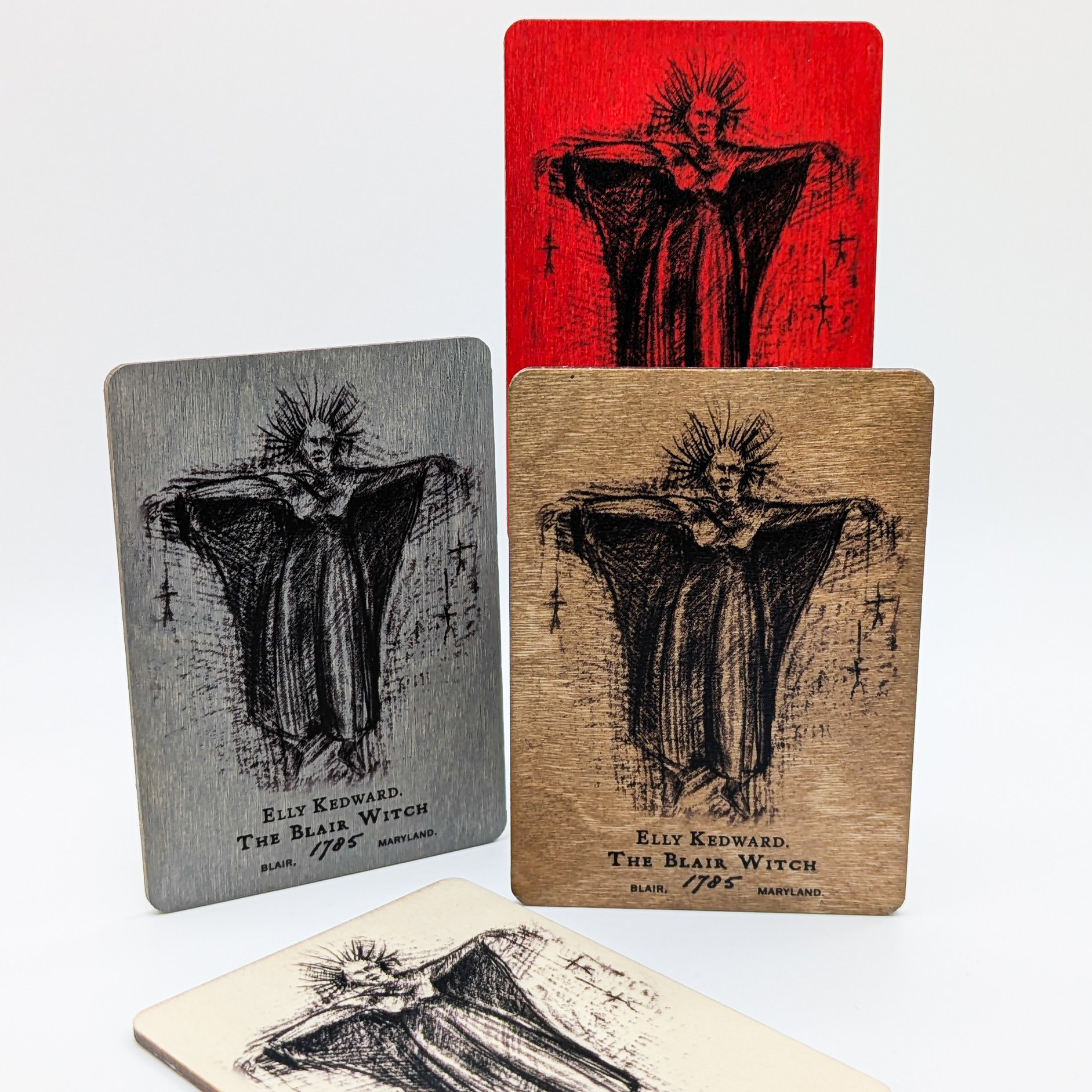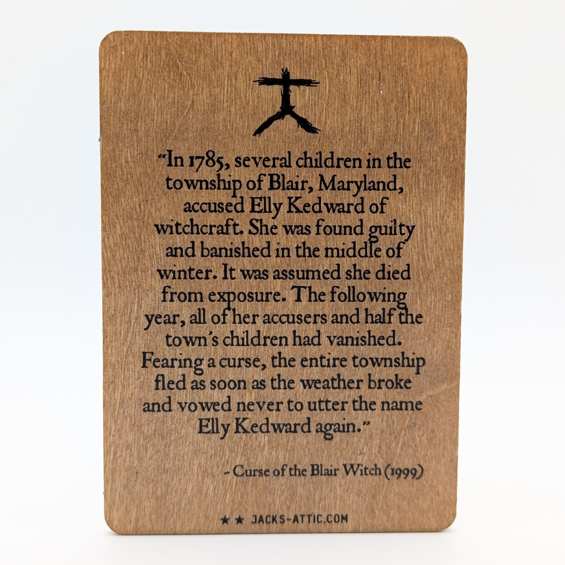 This is the first fully wooden trading card from Jack's Attic. Adorning the front is an artistic depiction of what the Blair Witch may look like based on the few first-hand accounts of those that had met her and survived to tell the tale. The back of the card gives a brief historical overview of the events that led up to Elly's banishment and the following curse that befell the village of Blair.
