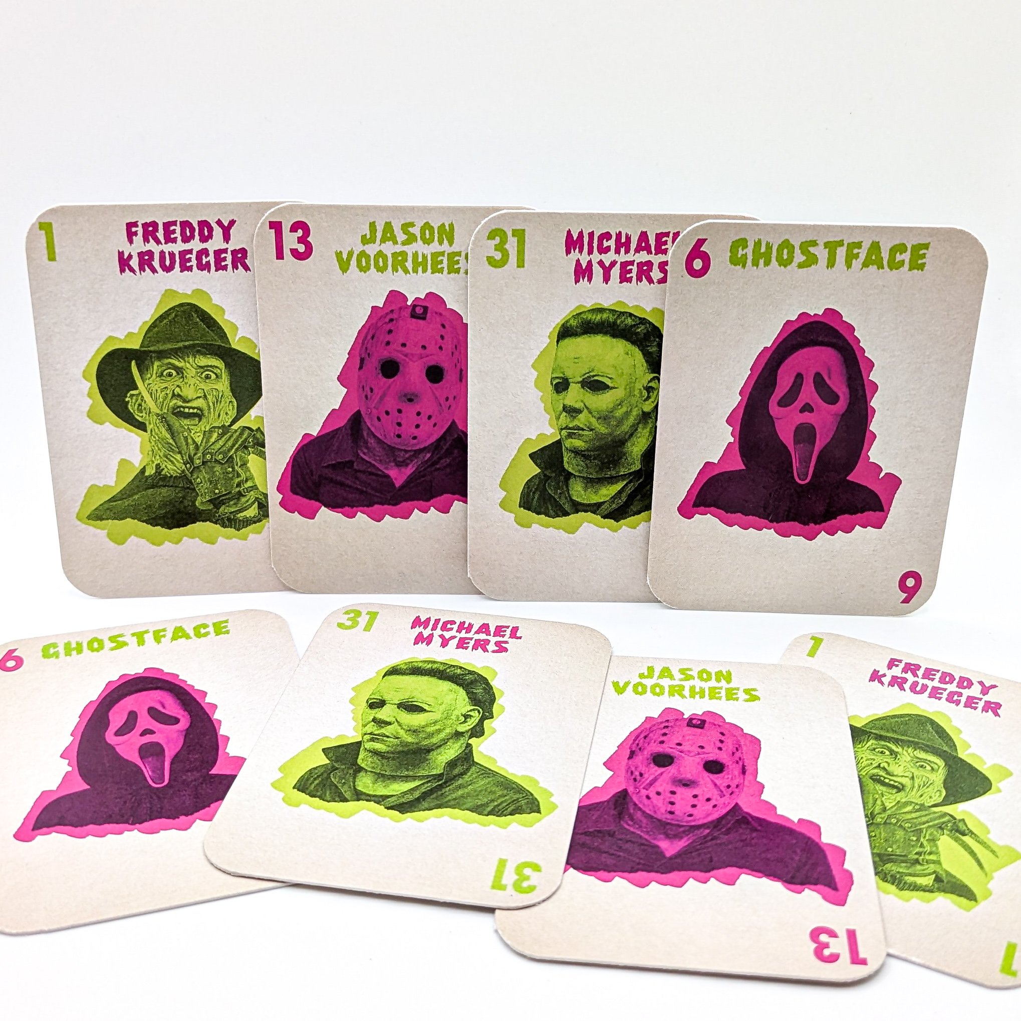 I decided to take that legendary set and modernize it with some of our favorite horror icons from this day and age. Highlighted here in this four (4) card set is everyone's favorite dream demon, Freddy Krueger, Haddonfield's resident boogeyman, Michael Myers, the Crystal Lake camp slasher, Jason Voorhees and Woodsboro's favorite telephonic madman, Ghostface.